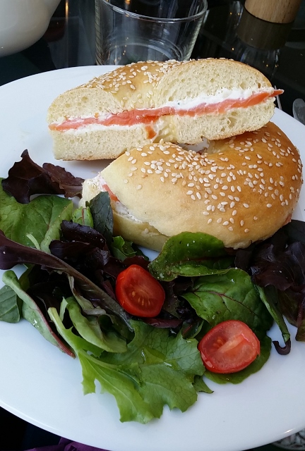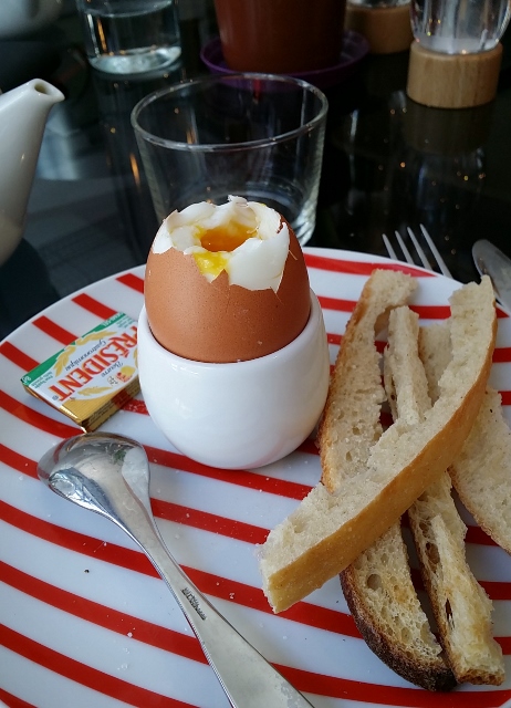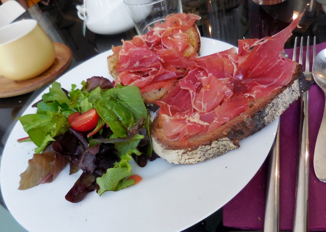 Au menu du brunch à 19€ : jus de fruits frais, boisson chaude, viennoiserie ou tartines, œuf à la coque et ses mouillettes, plat au choix (ce jour-là Pan con tomate, jambon, salade ou bagel truite fumée, crème et salade), salade de fruit du jour. Le jus de fruits, le plat et le dessert changent chaque semaine. A noter que les marques de thé sont très variées. Il s’agit des mêmes que l’on peut retrouver dans l’offre A l’Unithé.