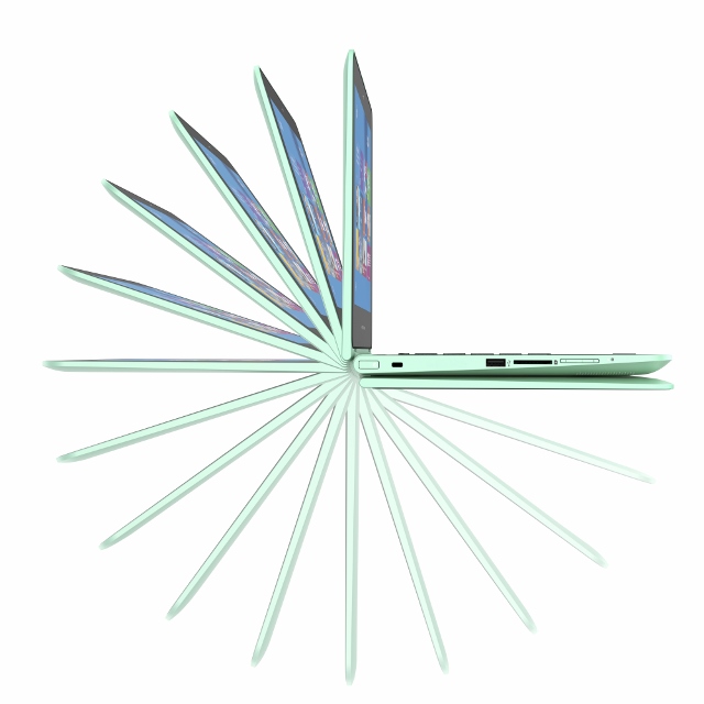Viennent ensuite les HP Pavillon x360 aux couleurs acidulées. Ils peuvent s’utiliser en mode PC portable pour travailler, en mode chevalet pour partager, en mode tente pour se divertir et enfin en mode tablette.