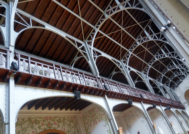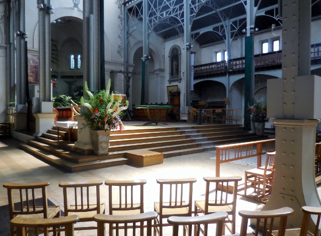 Depuis que les expositions universelles se tenaient au Champs de Mars, les centaines d’ouvriers chargés d’œuvrer à ces manifestations logeaient dans le quatorzième arrondissement de Paris. L’église Notre Dame du Travail fut construite pour eux entre 1899 et 1901, en remplacement de Notre Dame de Plaisance, devenue trop petite. Aux façades extérieures en meulière, moellons et pierre de taille de style roman, l’architecte Jules Astruc a opposé un intérieur aux voûtes formées d’arceaux métalliques, portées par de fines colonnettes en fer, qui donnent à l’édifice une clarté et une légèreté exceptionnelles.