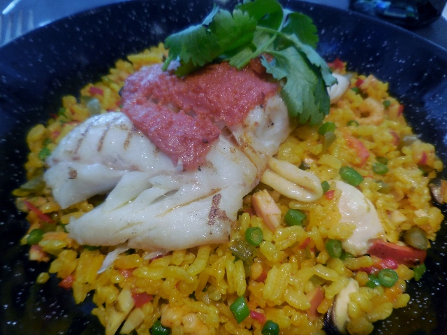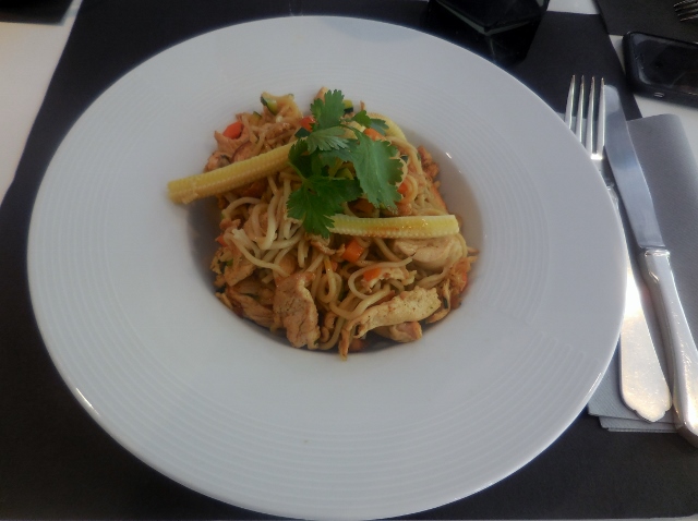 De la table où nous étions installés, nous pouvions apercevoir le jardin, calme, fleuri… et ponctuellement inaccessible en raison de la météo. Aussi, pour ne pas se laisser abattre, nous nous sommes rapidement plongés dans la carte. Bien que simple, les plats proposés semblaient tous très bons, et nous avons hésité avant de nous lancer. Sur les conseils d’un habitué, nous avons finalement opté pour les signatures de la carte : Poulet façon Thaï et nouilles sautées aux légumes, Coquillettes des Grands à l’huile de truffe, Cheeseburger Frites et Pavé de cabillaud rôti en croûte de chorizo façon Paella (mon choix).
