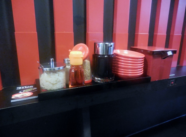 La décoration rouge et noire du restaurant est inspirée du Torii, portique en bois rouge qui marque l’entrée d’un sanctuaire shinto (j’ai trouvé cette information sur leur page Facebook). Avant même le savoir, je trouvais que ces couleurs donnaient une allure élégante à la salle de restaurant.