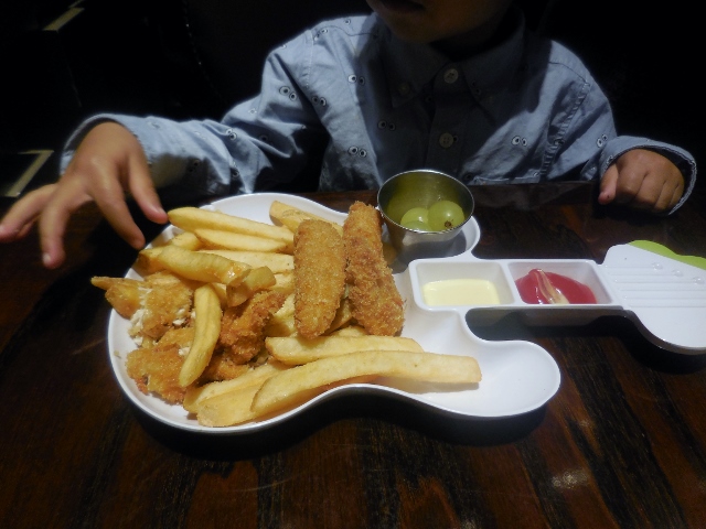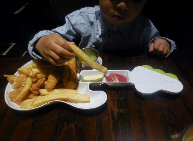 Le menu enfant comporte non seulement des classiques américains (burger, hot dog, mac and cheese… ), mais aussi des plats végétariens ou plus sains (filet de poulet grillé servi avec légumes et fruits, mélange de salades accompagné de dés de poulet et bâtonnets de crudités, pâtes aux légumes…). Fidèle à ses habitudes de restaurant, Mon Lutin a choisi les aiguillettes de poulet panées et des frites : autant manger ce que maman ne prépare pas à la maison.