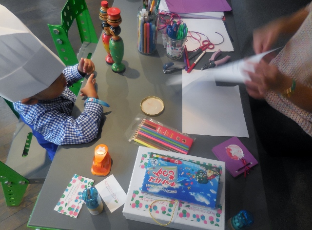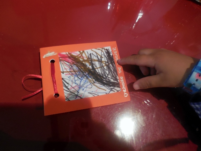 Lorsqu’il a terminé son grimoire et qu’il a souhaité nous rejoindre, la jeune fille l’a raccompagné à notre table (je lui avais indiqué où elle se trouvait). Et notre Lutin heureux nous a montré fièrement l’oeuvre réalisée de ses petites mains.