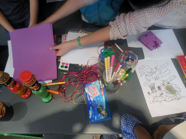 J’ai ensuite accompagné mon fils dans le superbe espace dédié aux petits. La jeune femme chargée d’animer la séance était déjà sur place et préparait les fournitures pour l’atelier du jour. Elle a gentiment installé mon fils, lui a proposé une feuille pour patienter en dessinant, puis m’a expliquée comment la séance allait se dérouler. Une fois le dessin terminé, nous retournés à table pour déjeuner. Nous avons trouvé l’attente assez longue, aussi Mon Lutin a dévoré son plat pour retourner au plus vite à son atelier. Pour la première fois, Mon Héros et moi n’avons pas eu à nous relayer pour le surveiller : il n’était pas livré à lui-même, sans surveillance au milieu d’une horde d’enfants, mais pris en charge pour un atelier créatif au sein d’un petit groupe. Et cela fait toute la différence. Certes, nous avons jeté une tête une ou deux fois, pour nous assurer qu’il ne faisait pas tourner l’animatrice en bourrique, mais nous sommes restés quelques secondes seulement. Nous avons tranquillement déjeuné à deux, tandis que notre fils était très occupé.