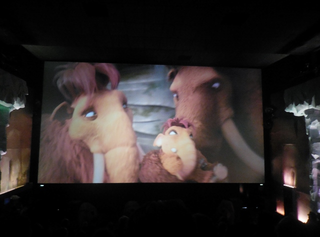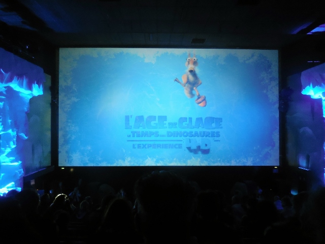 Dans la salle de projection (au décor de montagnes de glace), la neige tombait en légers flocons. Une image de Scrat (l’un des héros du film), bloqué dans les glaces, était figée à l’écran. Quelques instants plus tard, l’image en question s’est fendillée, et nous avons reçu des projections de glace brisée : le film venait de commencer. Tout au long de l’aventure, nous pouvions ressentir des sensations identiques à celles des personnages : sol qui tremble, souffle du vent, neige, pluie… Le tout accompagné d’effets 3D particulièrement réalistes. Toute la famille a beaucoup apprécié.