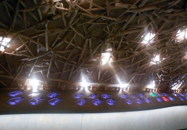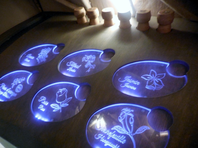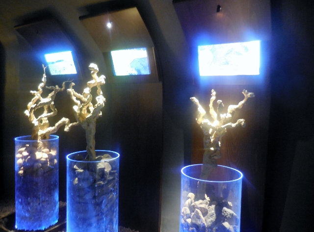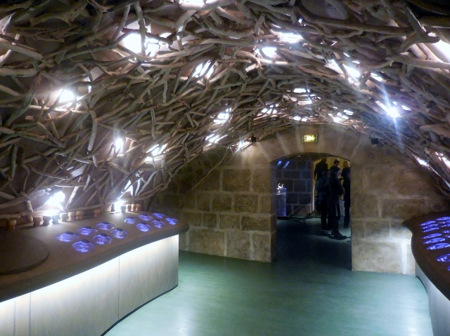 L’odorat (salle 2) : sous un nid de bois flottés, vous découvrez les 42 arômes captés dans de gros bouchons en bois. Vous jouez avec une grande roue montrant les correspondances entre terroirs, cépages et arômes. Vous apprenez même à reconnaître au nez les défauts du vin… et ce n’est pas évident du tout !