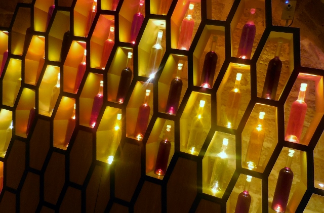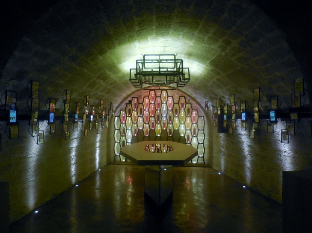 La vue (salle 5) : vous découvrez ici les secrets de la couleur du vin, les nuances de sa robe qui révèlent son terroir et son âge, les formes de bouteilles, les étiquettes. vous comparez les bouteilles éclairées de l’intérieur disposées sur un mur alvéolé.