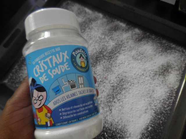 J’utilise depuis longtemps le bicarbonate de soude de Paulette en plus de ma lessive pour chaque machine. Désormais, je l’utilise également sous forme de cristaux de soude. Une fois saupoudré sur mes plaques de four bien grasses, elles retrouvent leur aspect d’origine.