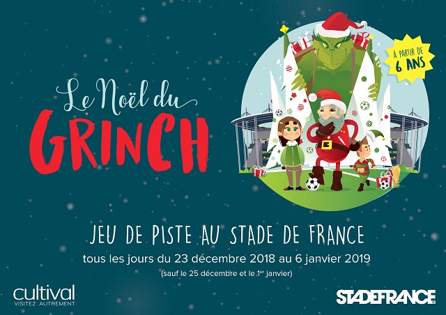 Cette année encore, Cultival (agence de sorties culturelles parisienne), propose un jeu de piste familial dans les coulisses du Stade de France. Du 23 décembre 2018 au 6 janvier 2019, suivez les indices laissés à travers tout le stade, et partez à la recherche du Grinch. Mon Lutin et moi avions participé à cet événement l’an dernier et nous avions adoré !