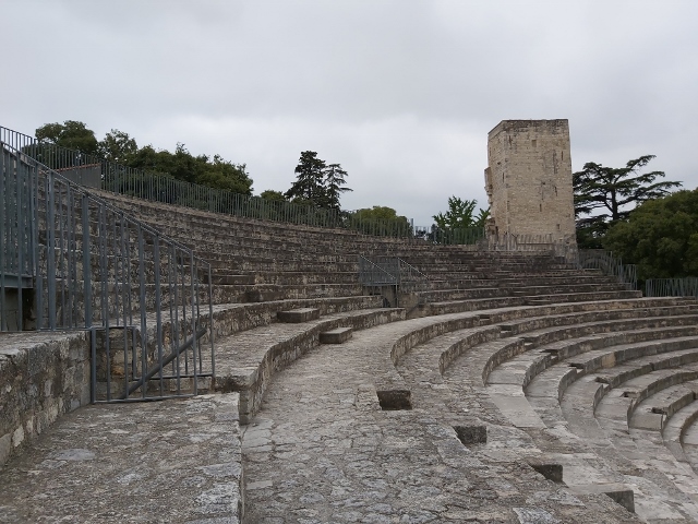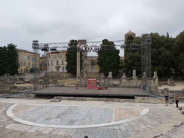 Le théâtre romain d’Arles date de la fin du 1er siècle avant J-C. Seuls subsistent quelques gradins, l’orchestre, la fosse du rideau de scène et deux hautes colonnes de marbre coiffée d’un fragment d’entablement.