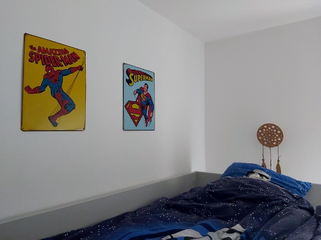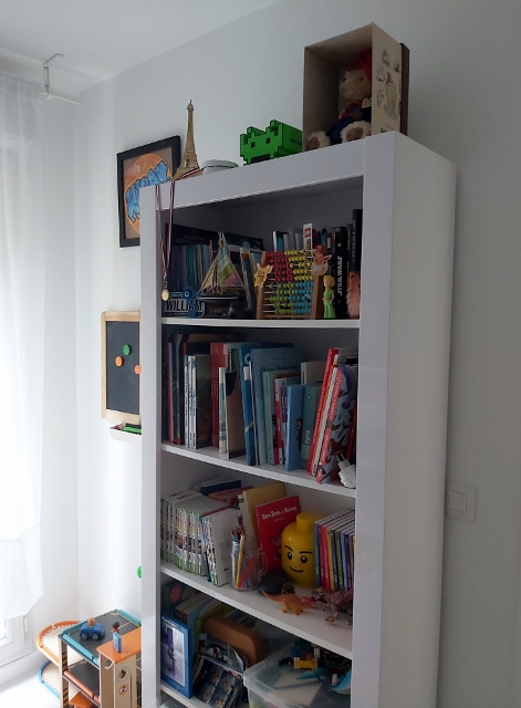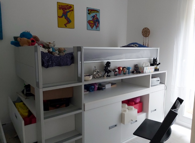 Nous avons pu ranger tous les jeux et jouets dans les placards (il y a une armoire pour les vêtements) et ajouté une bibliothèque. Mon Lutin est ravi de sa nouvelle chambre, et nous très contents de l’investissement. En effet, ce lit Gautier résiste à un poids jusqu’à 260 kilos, lancé depuis 2 mètres de haut ! Donc c’est bon jusqu’à son départ de la maison ! Vous aimez ?