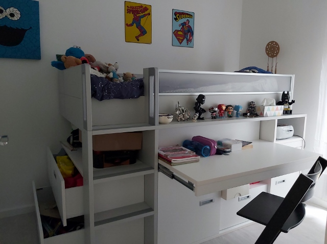 Une page se tourne dans la chambre de Mon Lutin ! Après avoir utilisé le même lit évolutif Stokke de sa naissance à 7 ans et demi, il a désormais un “lit de grand” ! Comme la chambre de mon fils est toute petite (moins de 9m2), notre choix s’est porté sur un lit gain de place Dimix de chez Gautier. Il s’agit d’un lit haut, qui fait également bureau, et présente en plus de nombreux rangements.