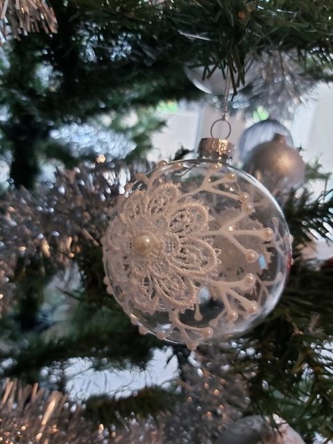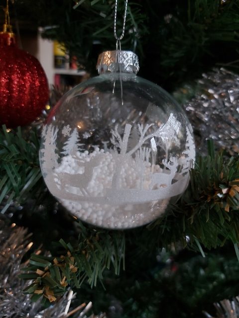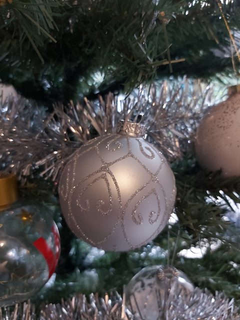 C’est le même sapin artificiel que l’an dernier (et autres années précédentes). En revanche, j’ai acheté quelques boules supplémentaires chez Action. Je voulais du blanc, du verre et de l’argent.