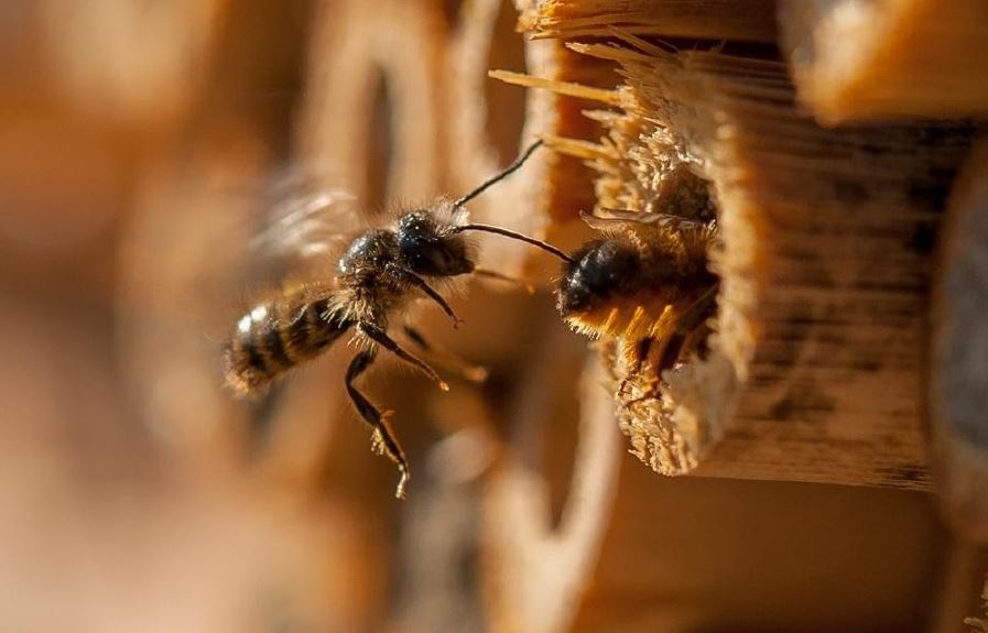 Au printemps, les abeilles maçonnes éclosent de leur cocon dans lequel elles étaient en hibernation. Selon la température, cela peut prendre de 10 à 30 jours. Elles parcourent des distances allant de 100 à 300 mètres pour récolter du pollen et du nectar pour leurs progénitures pondues dans les tubes de la maisonnette.