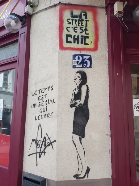 Miss Tic est une artiste parisienne, plasticienne et poète. Elle manie le pochoir aussi bien que les mots, et couvre les murs de ses jeux de mots, toujours très justes. Voici une de mes phrases préférées repérée sur la Butte aux Cailles.