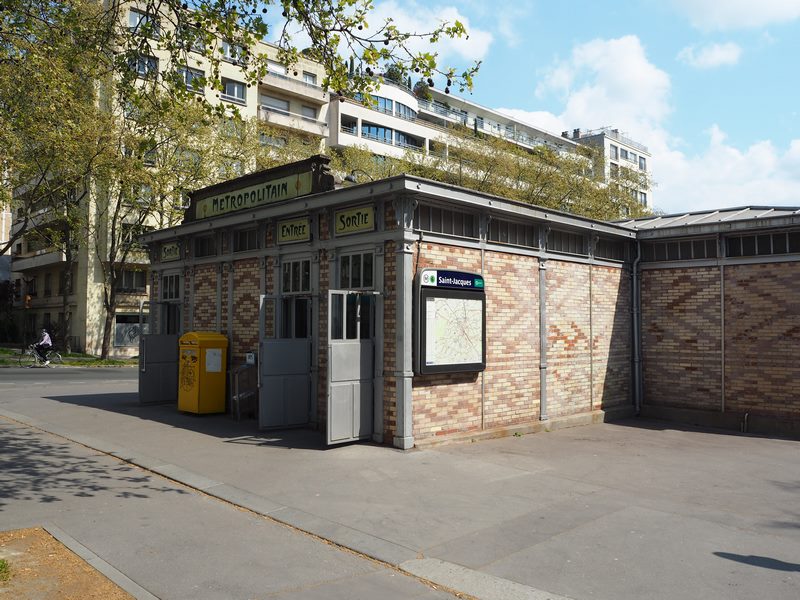 La station de métro Saint-Jacques est située sur la Ligne 6 du métro de Paris. L’unique accès se trouve sur le terre-plein central du boulevard du même nom. Sa particularité : il s’agit de l’une des rares stations à posséder un édicule de type “châlet” au-dessus des voies. On doit l’édicule de cette petite station à Jean-Camille Formigé. On y trouve un motif en briques de couleurs, et des écritures qui rappellent les motifs floraux si chers au mouvement Art Nouveau.
