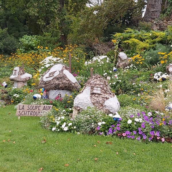 Maisons, potager, laboratoire, chaudron… Cet espace fleuri semble plus vrai que nature ! On peut s’amuser à rechercher les personnages de Peyo cachés dans le décor : le grand Schtroumpf, le Schtroumpf coquet, le Schtroumpf à lunette, la Schtroumpfette…