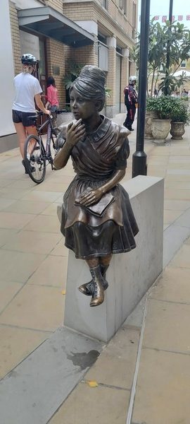 A peine arrivées, nous sommes allées voir la Mosaic House de Chiswick. C’est la maison de l’artiste Carrie Reichardt. Avec la participation des meilleurs artistes mosaïstes du monde, elle a recouvert les façades avant et arrière de millions de carrés de mosaïque. Chaque section raconte une histoire, sur un thème différent : lutte contre la peine de mort ou les droits civiques, philosophie, politique, religion, etc. On y trouve des références à Hokusai, Lewis Carroll, Matin Luther King, etc. Tous les détails comptent !