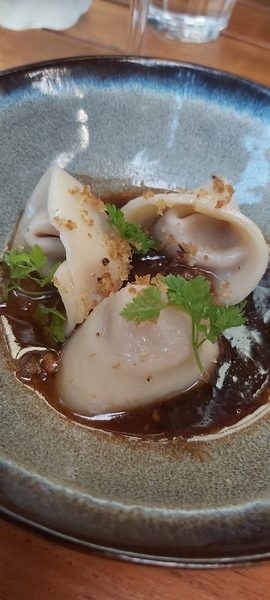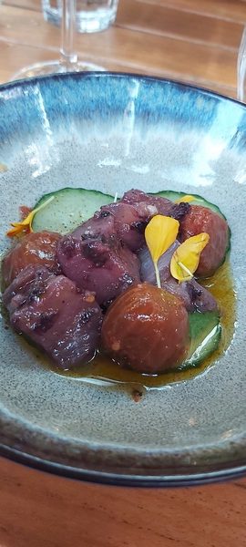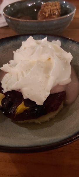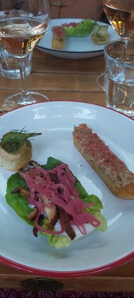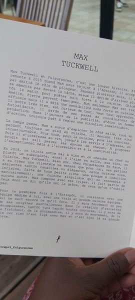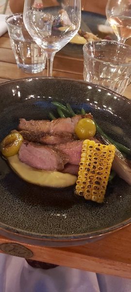 Le soir de mon passage dans cet établissement au cadre bucolique, le chef Max Tuckwell était en résidence. A la carte, un menu unique à 49€, avec amuse bouche + 4 plats (2 entrées, 1 plat au choix viande ou poisson et 1 dessert au choix). Pour la boisson, il faut compter une vingtaine d’euros pour la bouteille la moins chère. C’est délicieux et le personnel est aux petits soins. Une adresse hautement recommandable !