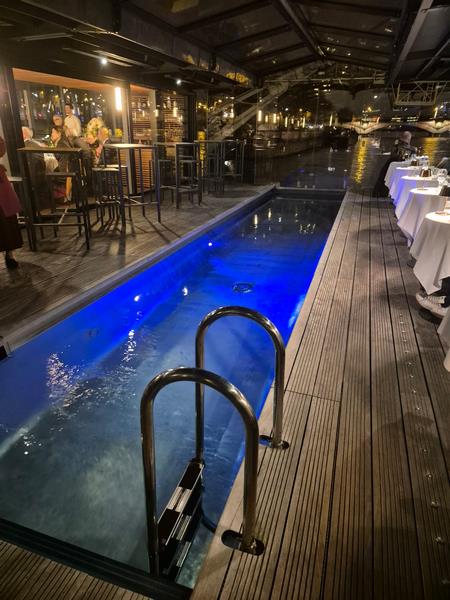 Le restaurant du OFF Paris Seine, c’est avant tout un cadre agréable. De grandes baies vitrées qui donnent sur la Seine, sur les quais ou sur le Viaduc d’Austerlitz. Une bassin longiligne, situé entre deux espaces de restauration, ajoute une touche estivale au décor. Un soir de février, il était couvert, mais j’imagine qu’il se transforme aisément en espace découvert, dès l’arrivée des beaux jours.