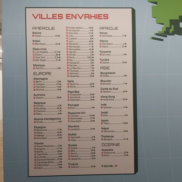 L’exposition nous transporte ensuite aux quatre coins du monde. De la baie de Cancun au Bhoutan, en passant par la Bolivie, le Maroc, le Brésil ou le Japon, Invader a envahit plus de 80 villes. Et même l’espace, avec un Space Invader dans la station spatiale internationale.