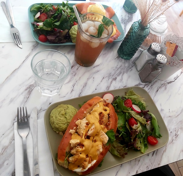 Au petit déjeuner comme au déjeuner, j’ai beaucoup aimé le Bloom Café. Dix sur dix pour les Oeufs Bénédicte et le Chicken. Quant au pancake banane, noisettes et chocolat fondu, j’ai été obligée d’emporter la moitié à la maison. Mention spéciale pour le thé glacé également.