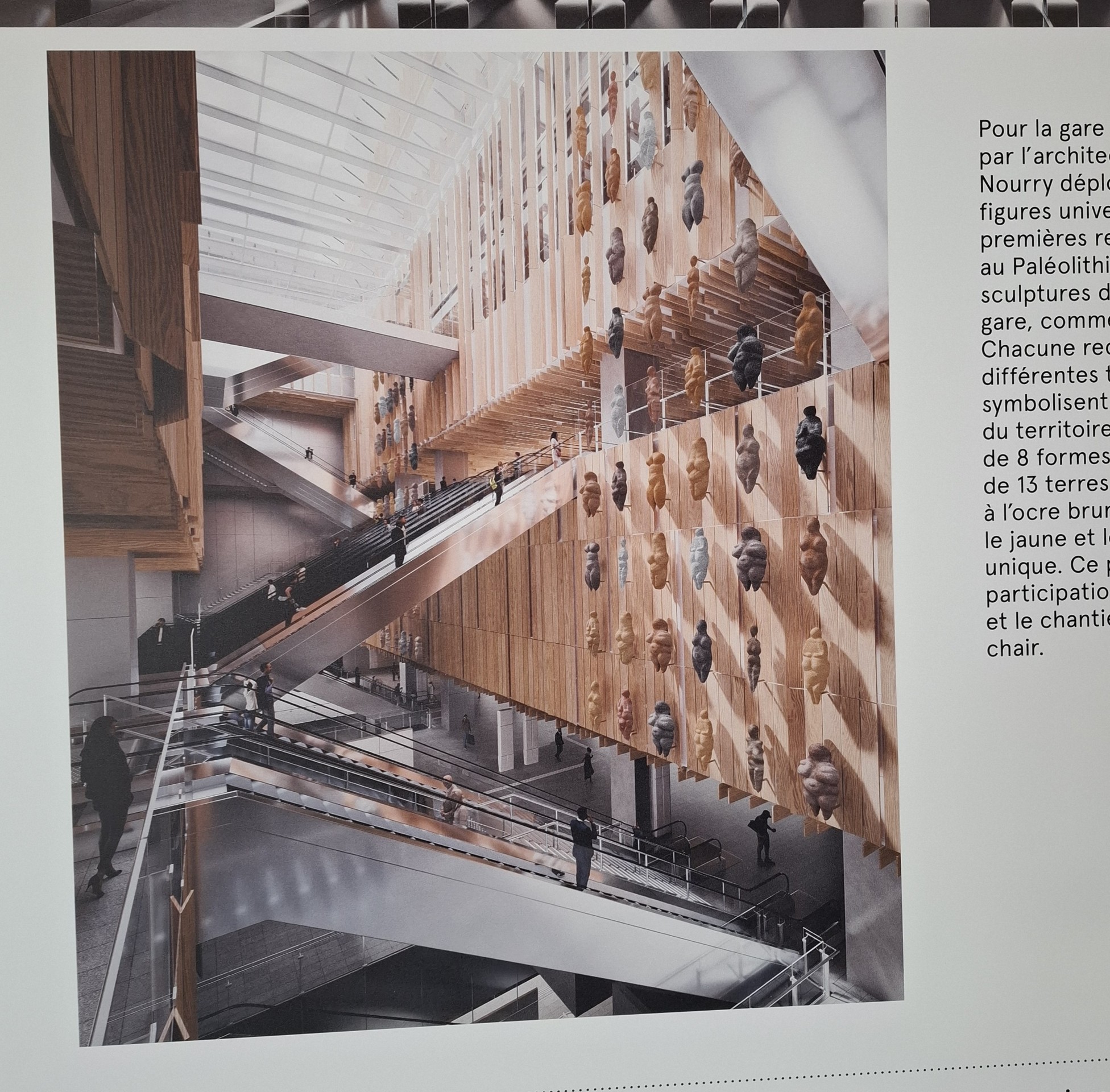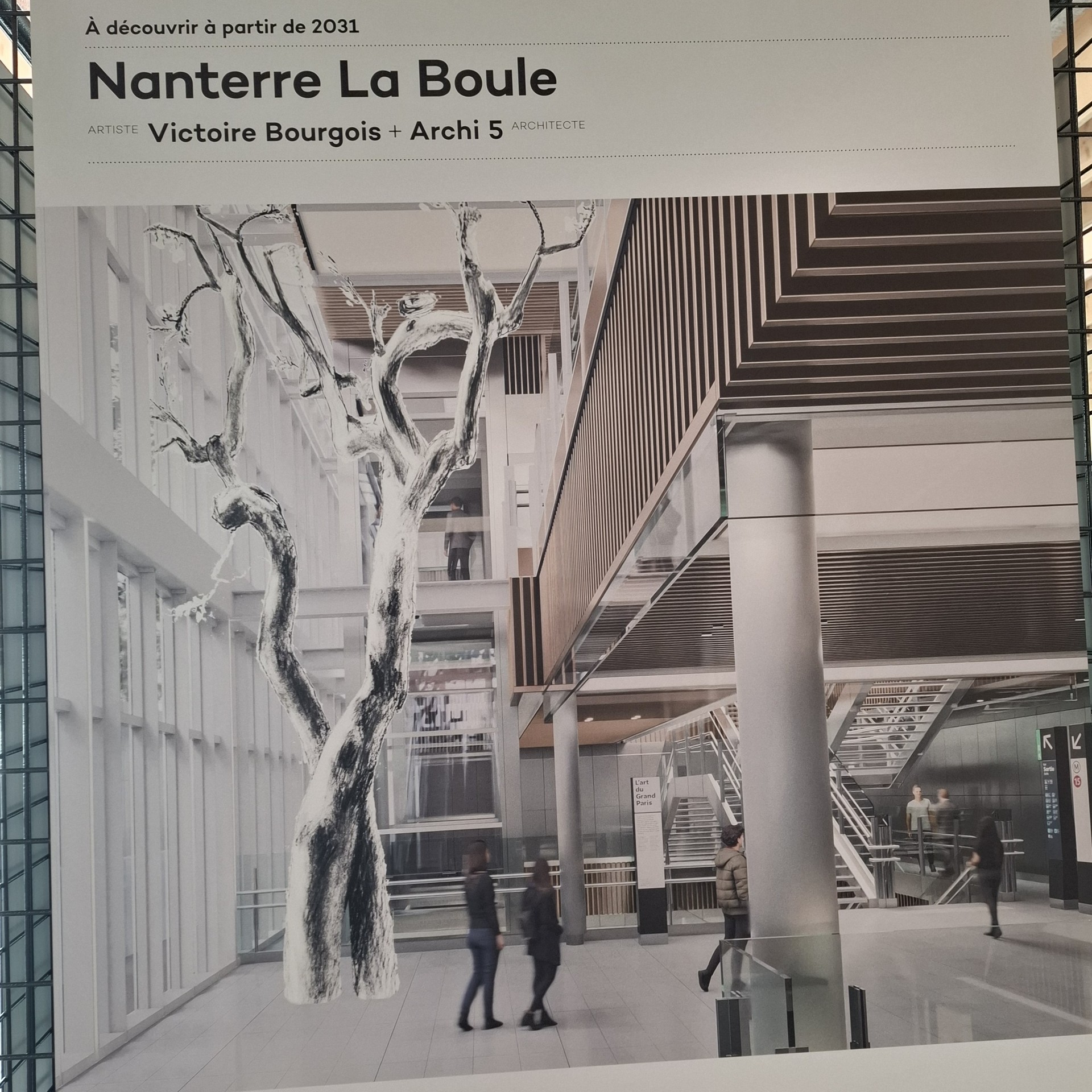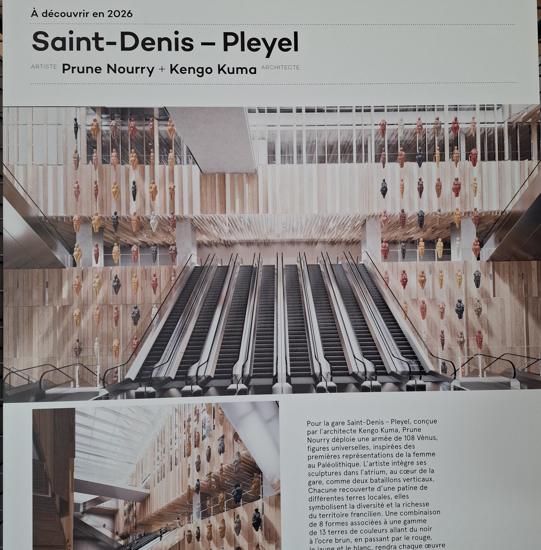 La station Saint-Denis – Pleyel, signée Kengo Kuma and Associates, accueillera à partir de 2026 une œuvre monumentale de Prune Nourry, qui sera installée face aux escalators principaux. En attendant, il suffit de descendre sur les quais pour tomber sur les illustrations de Sergio García Sánchez, qui donnent déjà le ton.