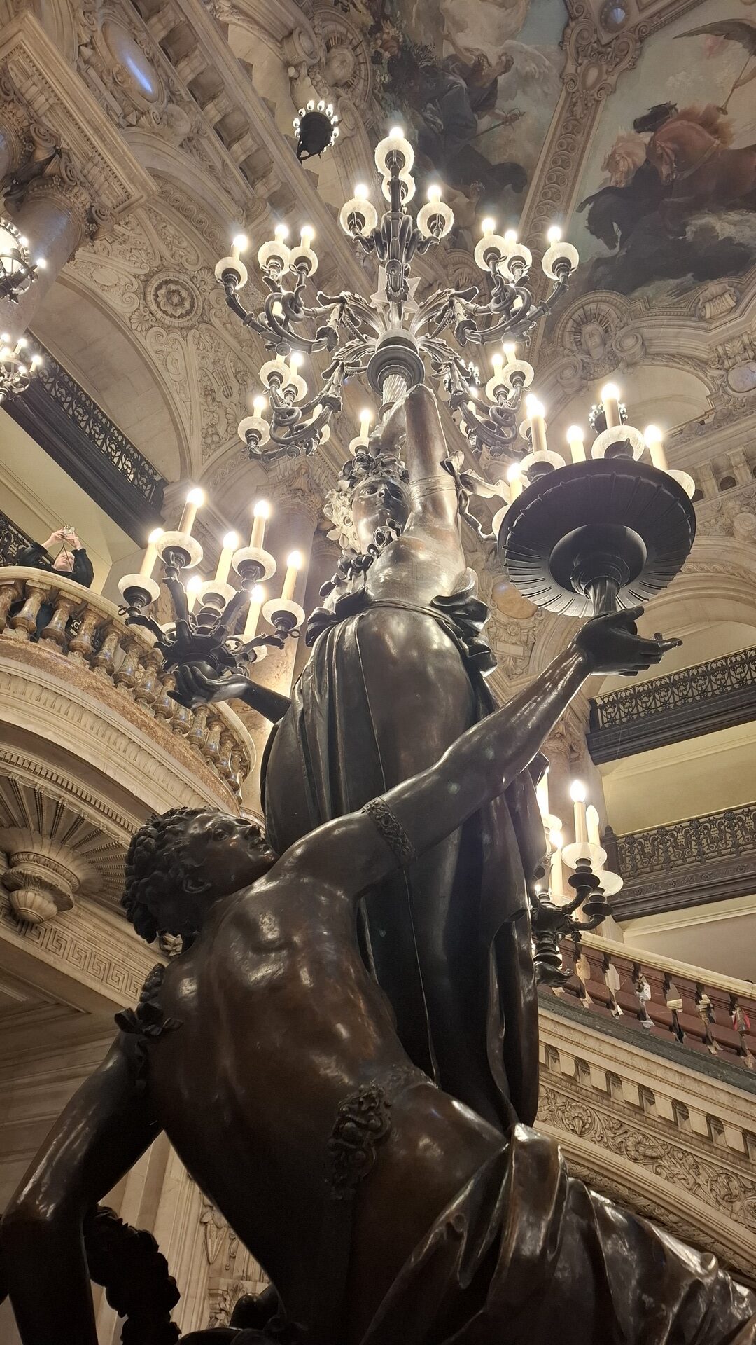 Et de trois ! C’est la troisième fois que je visite l’Opéra Garnier, à Paris. Je n’ai pourtant assisté qu’à un seul ballet ici, Les Enfants du Paradis, il y a une dizaine d’années. Mais ce sont surtout les espaces, les volumes et les détails qui me ramènent, encore et encore. Et chaque fois, c’est le même effet. Ce lieu me fascine toujours autant. Le bâtiment, à lui seul, est une œuvre d’art. Un chef-d’œuvre où se croisent architecture, sculpture et peinture.