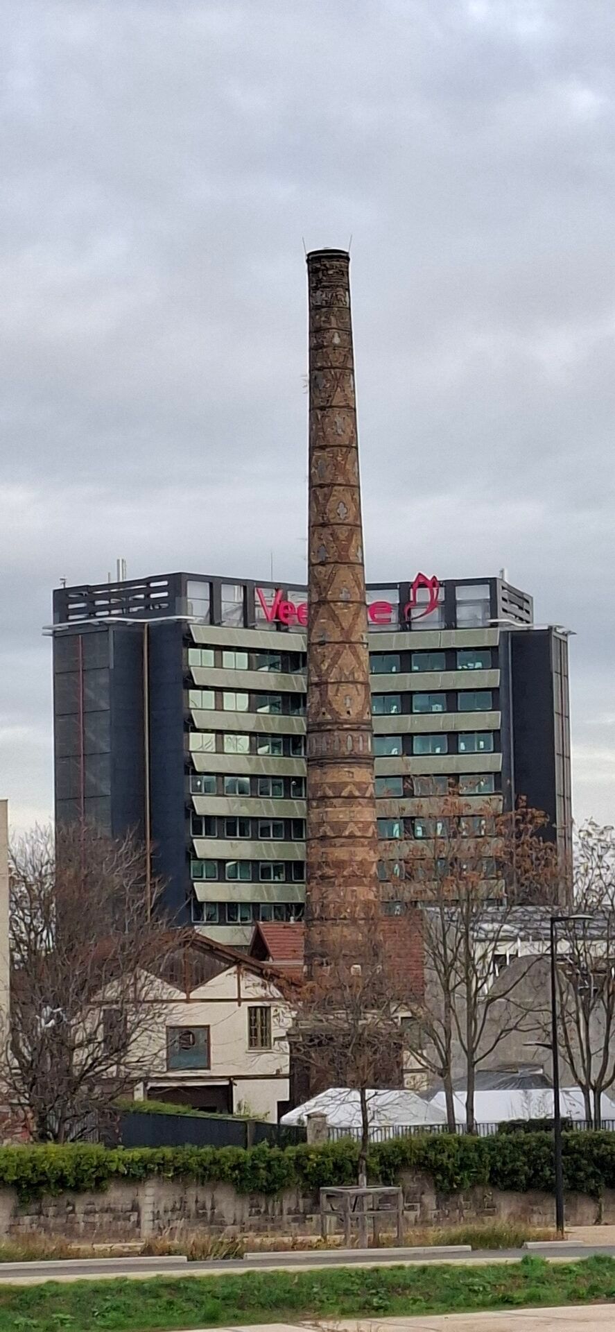 En empruntant la passerelle qui relie le Stade de France au Centre Aquatique olympique, j’ai enfin trouvé le point de vue idéal pour photographier cette cheminée industrielle qui me fascine depuis des années. Haute et élancée, cette construction en briques fait partie des repères urbains iconiques du paysage dyonisien. La cheminée Menier (c’est son nom), est l’un des derniers vestiges visibles de l’ancienne usine Menier de la Plaine Saint-Denis. Construite en 1862 par l’architecte Jules Saulnier, elle se dresse à quelques mètre du vieux colombier que j’avais précédemment évoqué.
