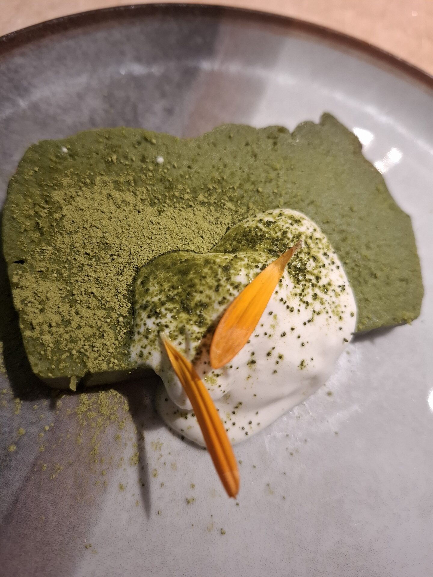 En dessert, nous avons opté pour une terrine de matcha, un gâteau mi-cuit servi avec une petite chantilly maison. Une fin de repas simple et gourmande.