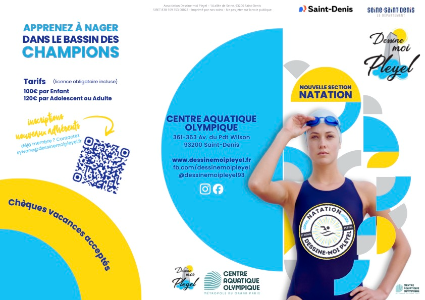 L’association Dessine-moi Pleyel ouvre une toute nouvelle section aquatique au Centre Aquatique Olympique de Saint-Denis. Les cours s’adressent à tous les publics : enfants, ados, adultes et seniors, que l’on soit débutant ou déjà à l’aise dans l’eau. De mon côté, j’ai réussi à convaincre mon ado de se lancer pour perfectionner sa nage. Une petite victoire.