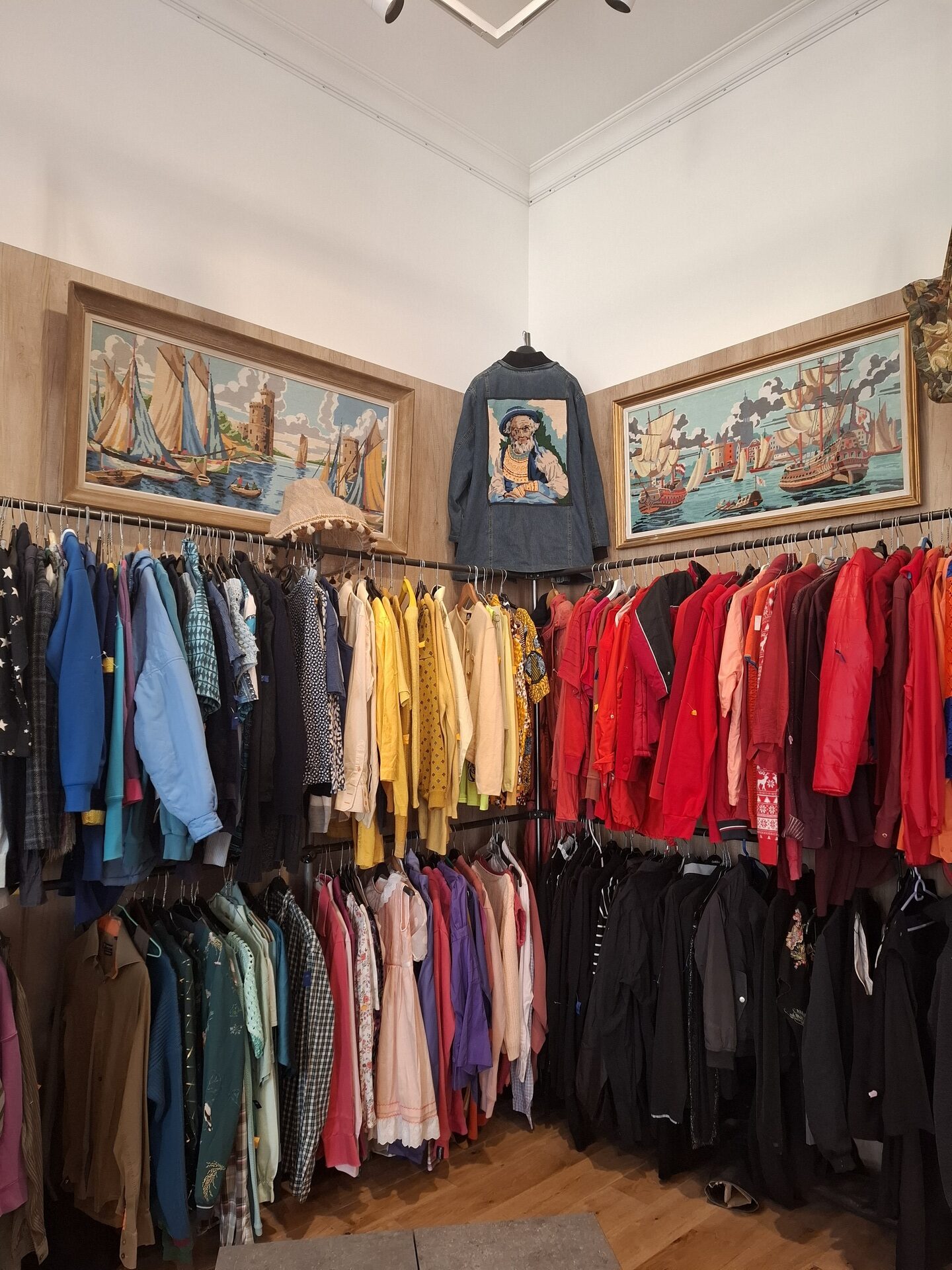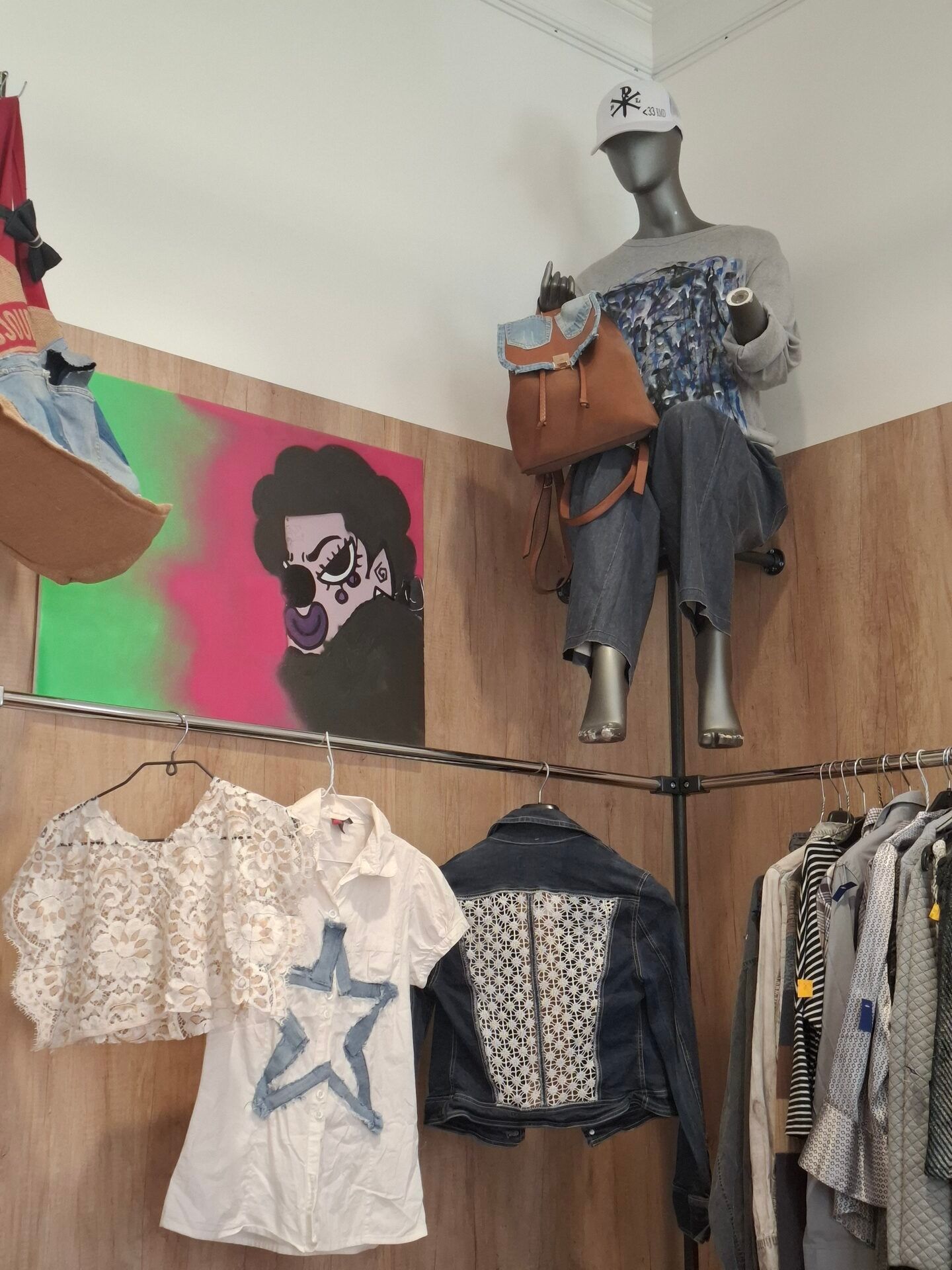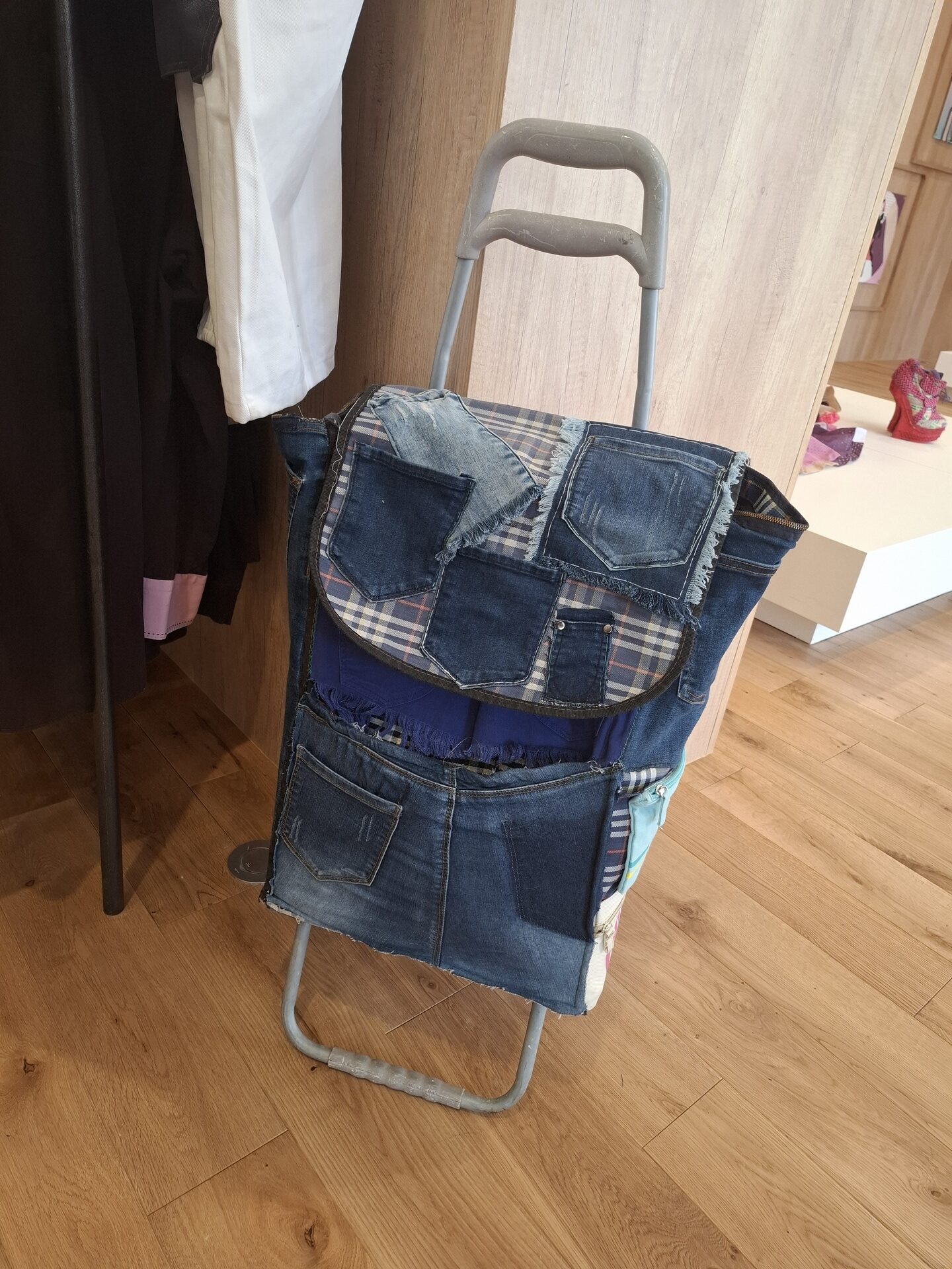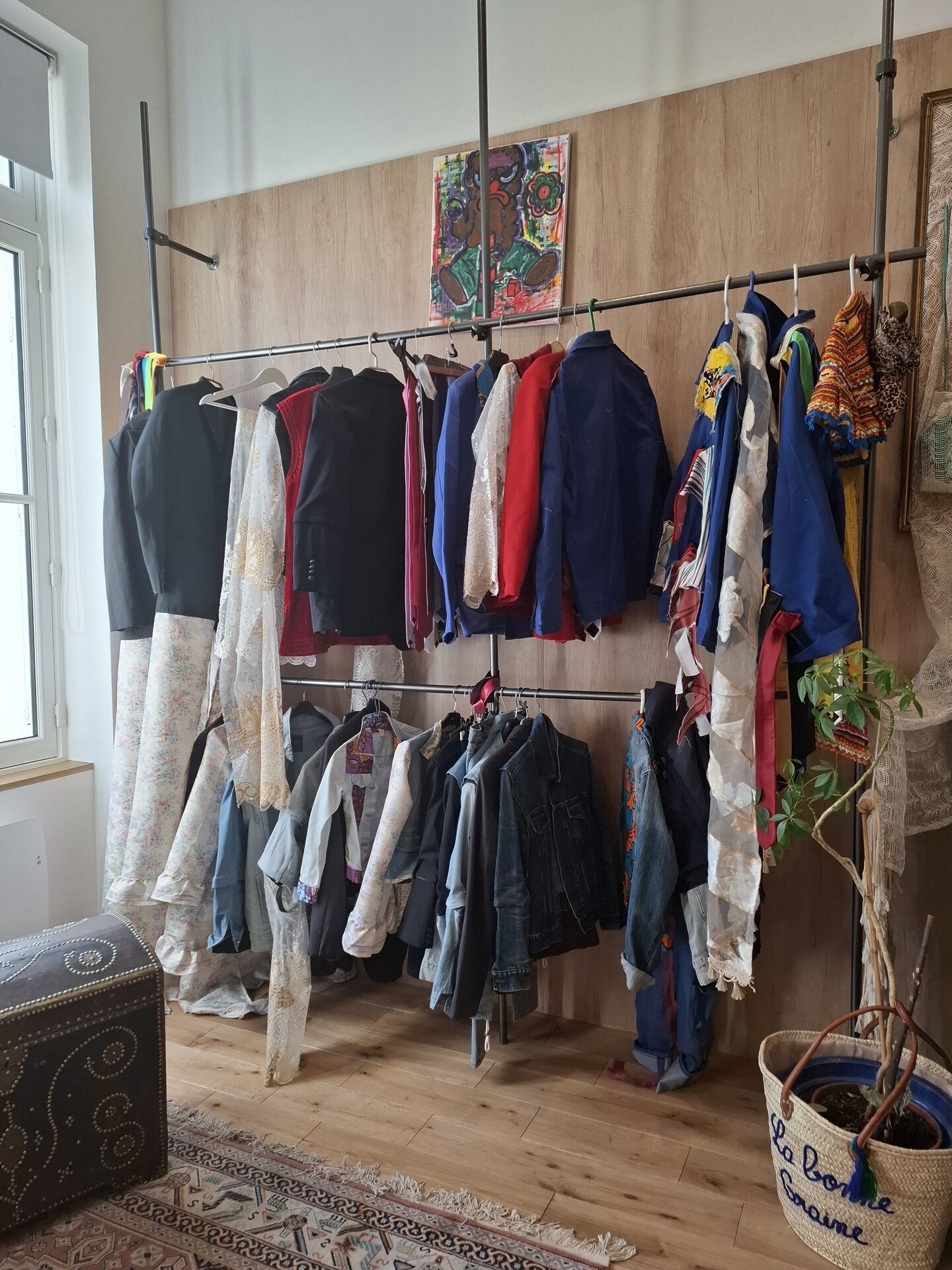 L’espace est aménagé comme un salon confortable et accueillant, dans lequel les vêtements sont suspendus sur des portants, classés par couleur. Vous découvrirez uniquement des créations issues de l’upcycling, c’est à dire fabriquées à partir de vêtements ou accessoires recyclés. En effet, Fripes Tease collecte, trie et transforme des vêtements, pour leur donner une nouvelle apparence, une seconde vie. Parmi les pièces ayant retenu mon attention, il y a des jupes cravate, des robes et des vestes mi denim mi broderie, un caddie en poches de jeans ou encore une robe en tresses de tissus !